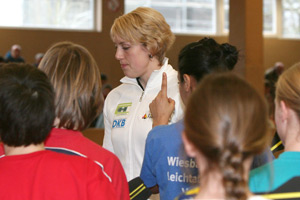 Die Speerwurf-Olympiadritte Christina Obergföll von der LG Offenburg und Bundestrainer Boris Henry (Saarbrücken) haben in der Wiesbadener Sporthalle in der Wettiner Straße ein öffentliches Schautraining mit etwa 70 begeisterten Kindern absolviert. „Das Wichtigste ist, dass alle Beteiligten Spaß haben und mit Freude bei der Sache sind“, sagte die 28-jährige Top-Leichtathletin nach der 90-minütigen Demonstration zum Mitmachen. „Wir möchten die Kinder mit solchen Aktionen ins Boot holen und dauerhaft an die Leichtathletik binden.“
