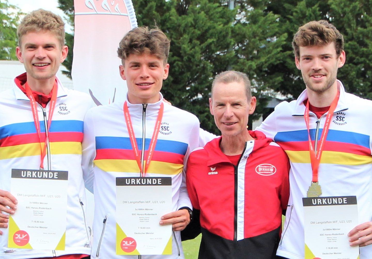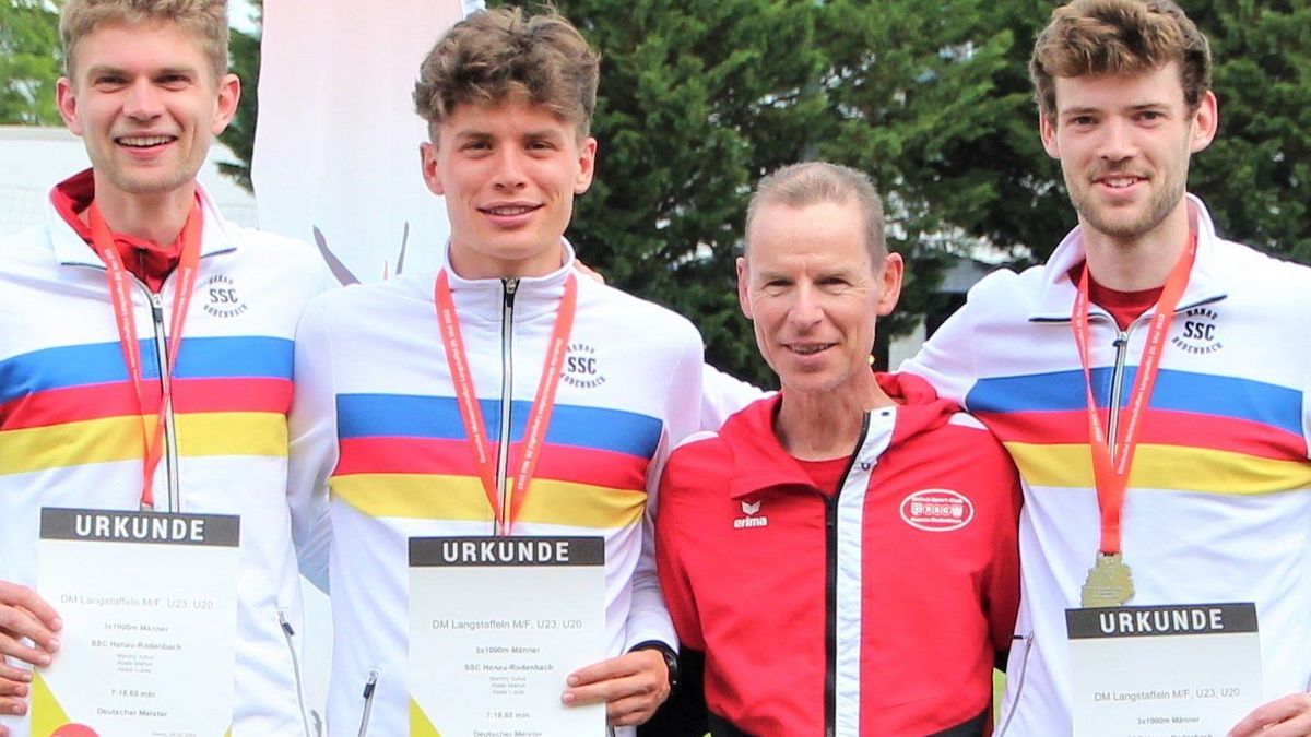 “Sensationell, das lief fantastisch”, kommentierte er seinen 2:21-Minuten-Abschnitt für die letzten 1000 Meter und holte sich das Lob des Olympiasiegers Dieter Baumann (1992/Barcelona) ab, der attestierte: “Das war genauso clever wie damals bei mir im 5000-Meter-Finale. Man muss halt die Lücke finden!” Stark auch das U20-Jugendteam des SSC in der Besetzung Tristan Kaufhold, Jannik Hümmer und Fynn Becker auf Rang fünf. Trotz des bereits am Vortag bestrittenen U18-EM-Qualifikationsrennens über 3000 Meter mit der neuen persönlichen Bestmarke von 8:37,08 Minuten eröffnete Tristan Kaufhold mit starken 2:33 Minuten auf Rang vier. Jannik Hümmer mit der Bestzeit von 2:37 Minuten und 5000-Meter-Hessenmeister Fynn Becker (2:35 Minuten) komplettierten das Trio, dem nach 7:45,95 Minuten sechs Sekunden zum Bronzeplatz der aus drei Vereinen bestehenden Startgemeinschaft Alzey-Framersheim-Worms (7:39,30 Minuten) fehlten.