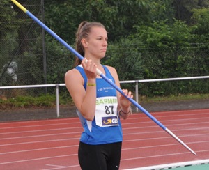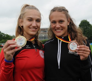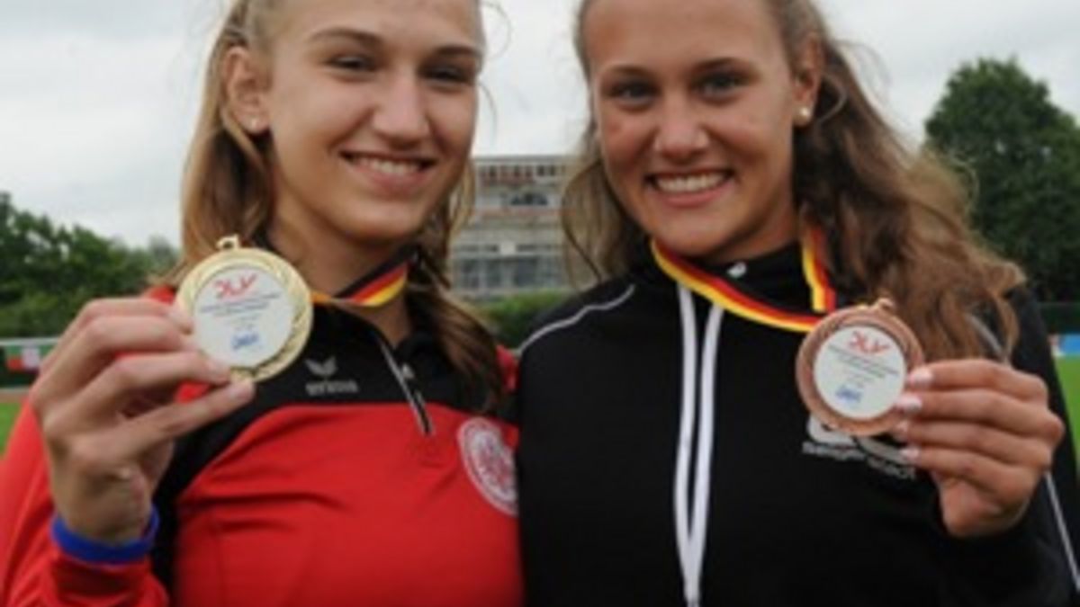 Mit sieben Medaillen, darunter drei Titel, schnitt der Nachwuchs des Hessischen Leichtathletik Verbandes bei den deutschen Jugend-Meisterschaften (U16) in den Blockwettkämpfen in Lage überaus erfolgreich ab und toppten die Edelmetall-Ausbeute der vergangenen Jahre. Eine Klasse für sich war einmal mehr Jenna Fee Feyerabend vom TV Groß-Gerau. Die Ausnahmeathletin wurde ihrer Favoritenrolle vollauf gerecht und krönte ihren überlegenen Erfolg im Block Sprint/Sprung (W15) mit einer neuen deutschen Bestleistung. Die 15-jährige Schülerin steigerte mit 3.004 Punkten die bereits 13 Jahre alte Rekordmarke von Diana Rach (Erfurt) um drei Zähler und verteidigte ihren Titel aus dem Vorjahr (damals W14). Die Kaderathletin steigerte zum Auftakt ihren Haurekord im Speerwerfen um mehr als zwei Meter auf 43,33 Meter, schockte damit die Konkurrenz und ging in Führung. Es folgten starke 11,76 Sekunden über die 80 Meter Hürden und 5,28 Meter im Weitsprung. Über 100 Meter wurden für sie 12,61 Sekunden gestoppt. Beim abschließenden Hochsprung setzte dann einmal mehr kräftiger Regen ein. Die Hochsprungspezialistin Jenna Fee Feyerabend, persönliche Bestleistung 1,80 Meter, flog bei 1,67 Metern über die Latte; doch als damit feststand, dass der DM-Rekord eingetütet war, beendete sie den Wettkampf.<ENDE/>