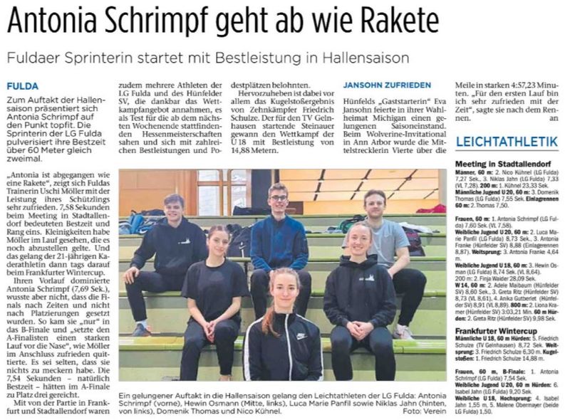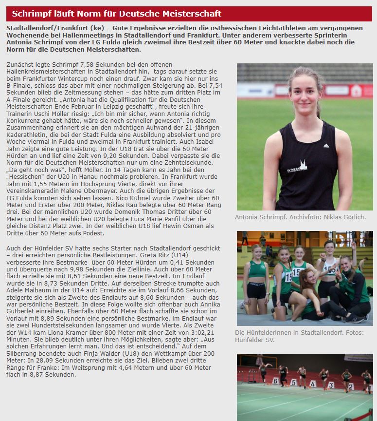 Gute Ergebnisse erzielten die osthessischen Leichtathleten am vergangenen Wochenende bei Hallenmeetings in Stadtallendorf und Frankfurt. Unter anderem verbesserte Sprinterin Antonia Schrimpf von der LG Fulda gleich zweimal ihre Bestzeit über 60 Meter und knackte dabei noch die Norm für die Deutschen Meisterschaften.