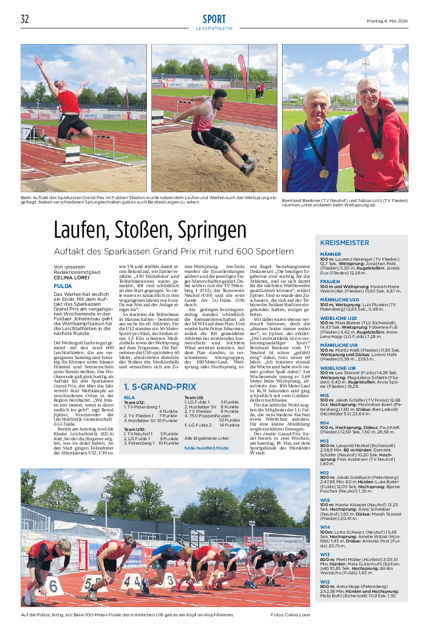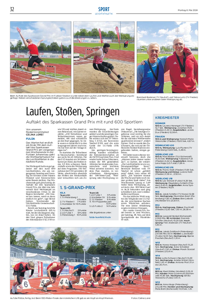 Ja, es geht wieder los: Die Sparkassen-Grand-Prix-Serie ist heute in die Saison 2024 gestartet. Los ist es heute um 09:30 Uhr mit der Kinderleichtathletik - kurz KiLa genannt - und der klassischen Leichtathletik in der Altersgruppe U14 gegangen; morgen folgen dann die Altersgruppen ab U16. Ausrichter des zweitägigen Leichtathletiksportfestes ist die LG Fulda, Austragungsort das Stadion Johannisau.