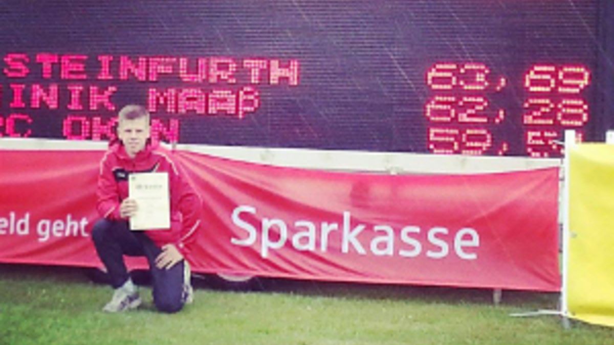 Das Ziel zum ersten Mal in seiner jungen Karriere die 60-Meter-Marke zu übertreffen (bei den Jugend-Winterwurfmeisterschaften im Februar holte Steinfurth Silber mit 59,40 m) hatte Konstantin Steinfurth bereits nach dem ersten Wurf erreicht. Das 5 Kilogramm schwere Wurfgerät schlug nach 60,19 Metern ein. "Das war einfach sensationell. Danach konnte ich es locker angehen lassen", sagte der Schützling von Klaus Steinfurth und Lutz Caspers. Und schon im zweiten Versuch legte der Eppsteiner nach. Die Lockerheit ergänzte er mit technischer Sicherheit. "Ich bin gut in die Drehung gekommen und dann lief es wie von selbst. Ich habe gleich gemerkt, dass der weit fliegt", erinnert sich der Schüler der Carl-von-Weinberg-Schule in Frankfurt. <ENDE/> Aber als 63,69 Meter auf der Weitentafel aufleuchteten, staunte selbst Konstantin Steinfurth. Und mit ihm der Jugend-Winterwurfmeister Dominik Maaß vom LAV Neustadt (Bayern). Dessen Hammer landete zwar viermal jenseits der 60 Meter (und damit einmal mehr als bei Steinfurth), doch an Steinfurths Leistung kam der Bayer mit seiner Tagesbestweite von 62,28 Meter nicht mehr heran.
