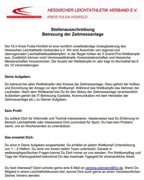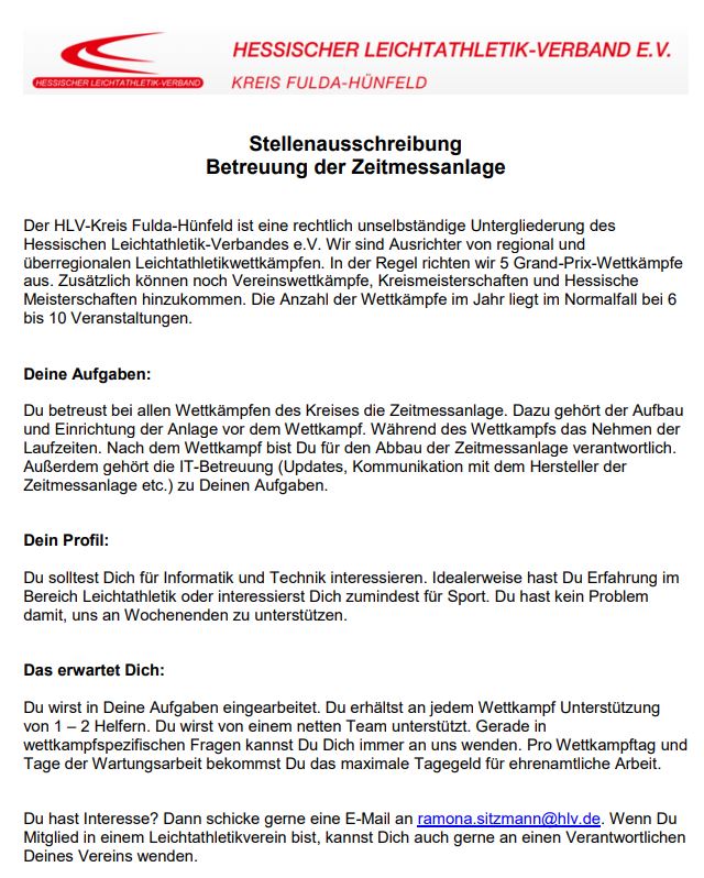 Der HLV-Kreis Fulda-Hünfeld sucht für den Betrieb und die Betreuung seiner Zeitmeaaanlage engagierte Kräfte auf Ehrenamtsbasis.