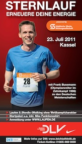 Einmal unter dem Jubel der Zuschauer in ein großes Stadion einlaufen. So wie die Marathon-Stars bei den Olympischen Spielen. Diesen Traum können sich Läuferinnen und Läufer sowie Walkerinnen und Walker am Samstag, 23. Juli bei den Deutschen Leichtathletik-Meisterschaften in Kassel erfüllen. Der Deutsche Leichtathletik-Verband bietet in Zusammenarbeit mit AS Event einen „Erneuere Deine Energie“-Sternlauf an, der von vier verschiedenen Startpunkten aus ins Kasseler Auestadion führt. Kurz bevor Deutschlands beste Leichtathleten in den Finals um die nationalen Titel und die Tickets zu den Leichtathletik-Weltmeisterschaften kämpfen, die Ende August im koreanischen Daegu stattfinden, kann man so stimmungsvoll ins Auestadion einlaufen und an der DM-Atmosphäre teilhaben. Und anschließend ganz entspannt von der Tribüne aus die Wettkämpfe im Stadion anschauen. Der Zehnkampf-Zweite der Olympischen Spiele von 1996, Frank Busemann, wird eine Gruppe ins Stadion führen.<ENDE/> Der Sternlauf ist kein Wettkampf. Hier läuft jeder mit dem anderen in einer Gruppe. Einsteiger sind besonders willkommen. Damit jeder das richtige Tempo und die passende Streckenlänge findet, werden vier verschiedene Kurse angeboten, auf denen Läufer, Walker und Nordic-Walker in zwei bis drei Gruppen unterschiedlich schnell unterwegs sein werden, bis sich alle zum gemeinsamen Einlauf ins Auestadion treffen. Wer`s ganz gemütlich angehen will, legt 3,5 Kilometer walkend in gut einer halben Stunde zurück. Die schnellsten rennen 11,5 Kilometer zum Auestadion in weniger als einer Stunde.