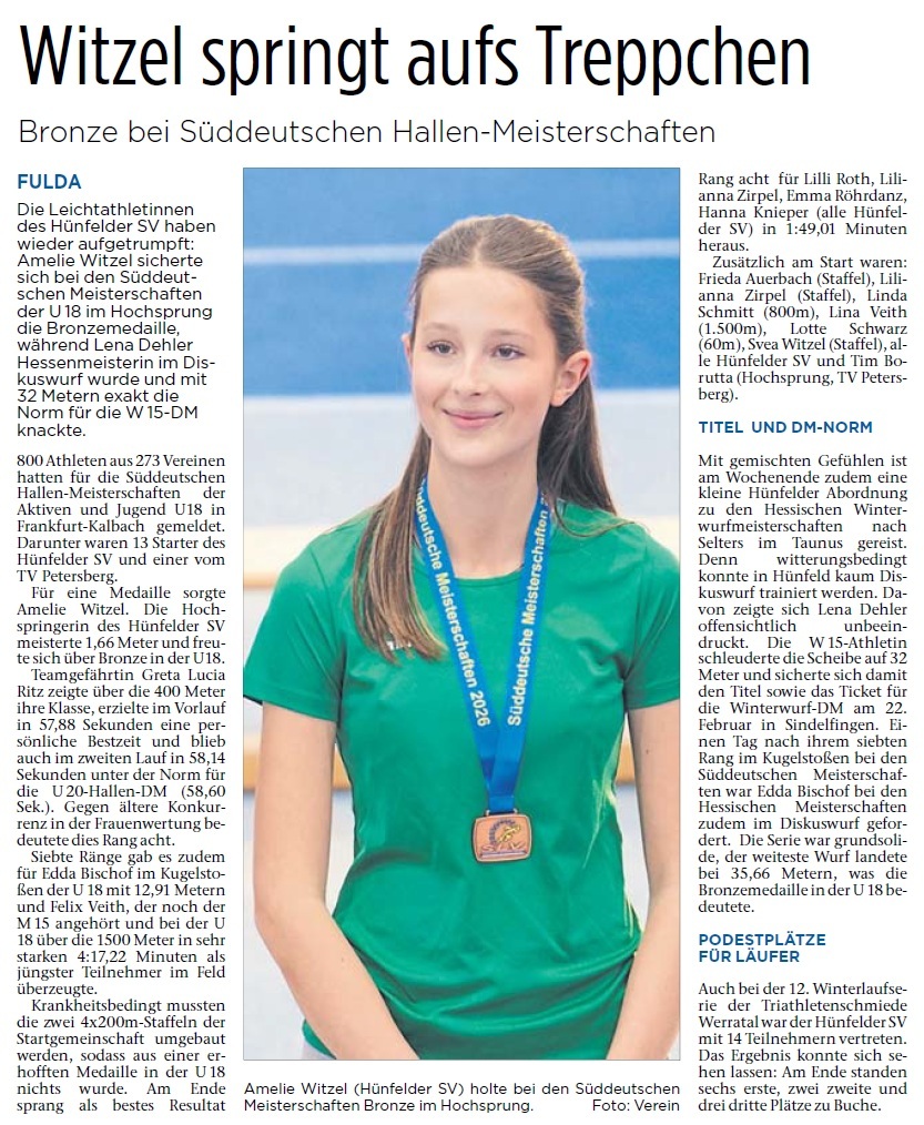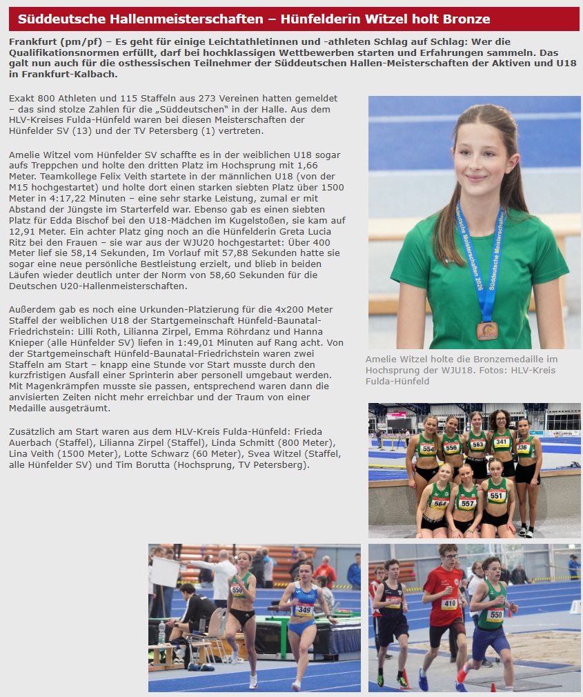 Zusätzlich am Start waren: Frieda Auerbach (Staffel), Lilianna Zirpel (Staffel), Linda Schmitt (800m), Lina Veith (1.500m), Lotte Schwarz (60m), Svea Witzel (Staffel), alle Hünfelder SV und Tim Borutta (Hochsprung), TV Petersberg