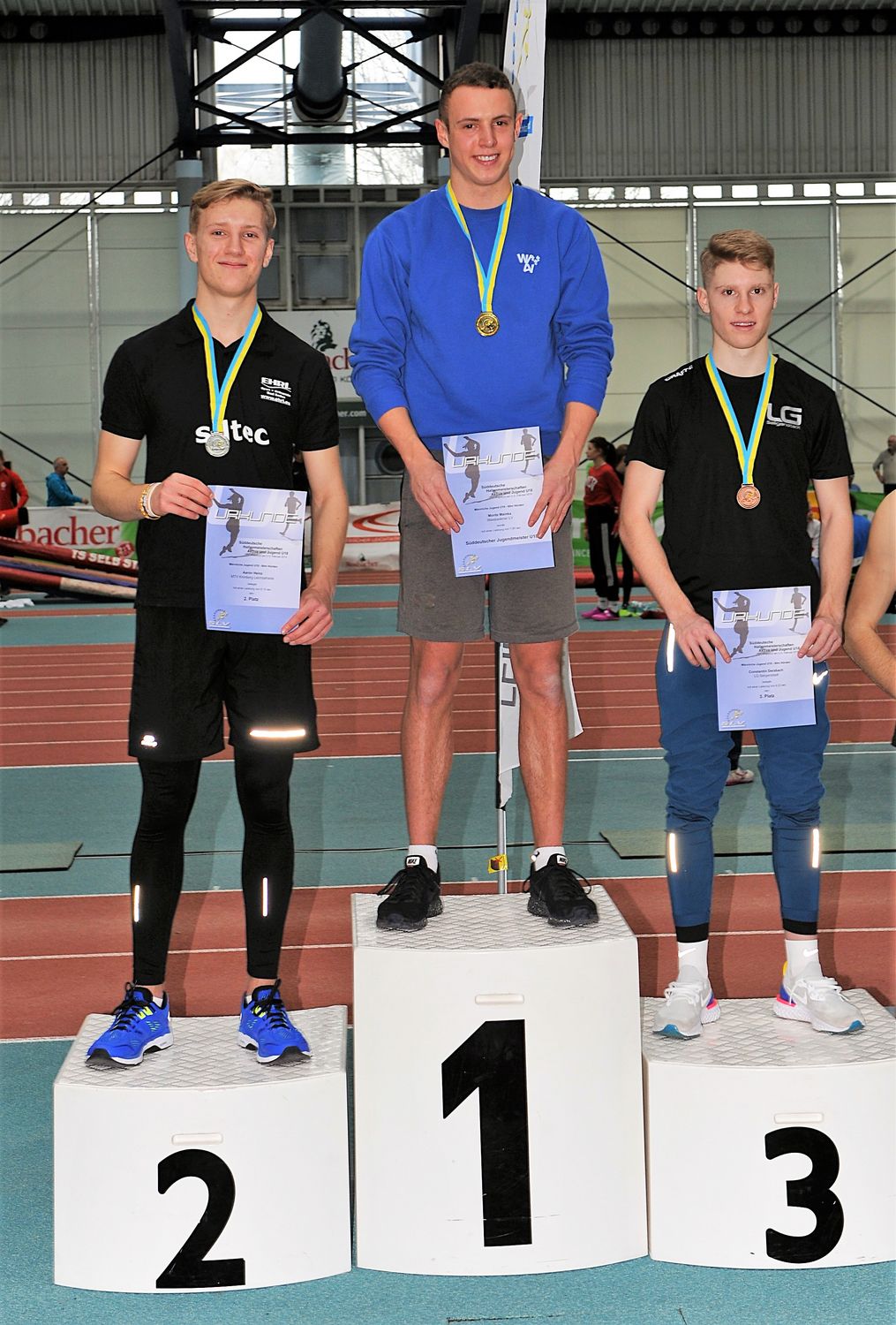 In der männlichen U18 sorgte Hürdensprinter Moritz Mainka (Wiesbadener LV) für die beste Tagesleistung. In 7,85 Sekunden verpasste er die deutsche Hallen-Bestleistung von Stefan Volzer (VfB Stuttgart) aus dem Jahr 2017 um nur vier Hundertstel. Aaron Heinz (8,15/MTV Kronberg) und Constantin Derzbach (8,22/LG Seligenstadt) sorgten für eine hessische Dreifachbesetzung auf dem Podium. Der 18-jährige U20-Hürdensprinter Volzer, mittlerweile für den VfL Sindelfingen laufend unterwegs, gewann übrigens den süddeutschen Männertitel in 7,87 Sekunden.