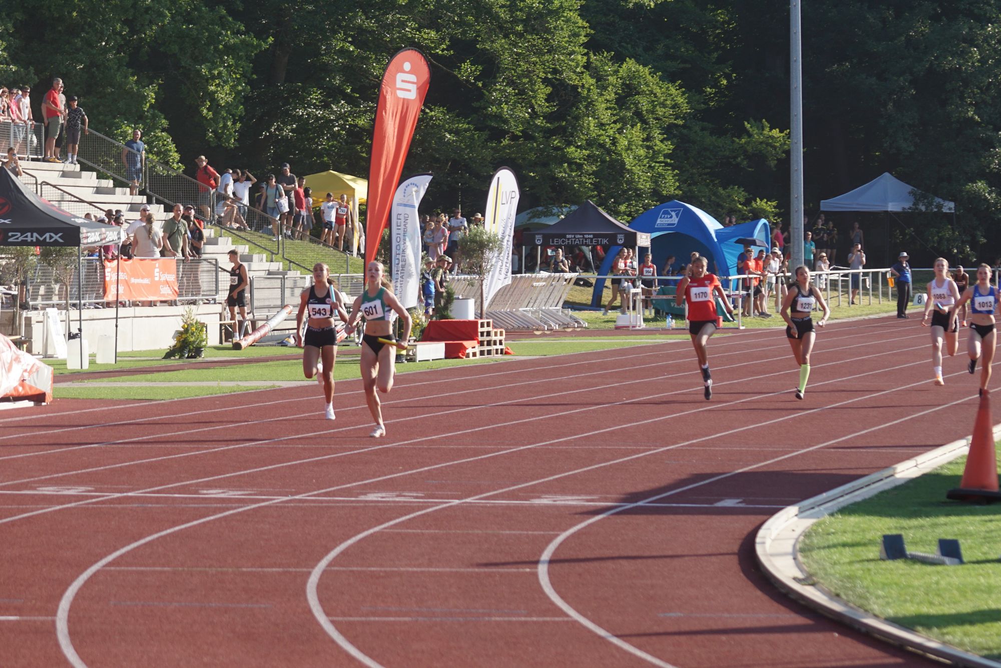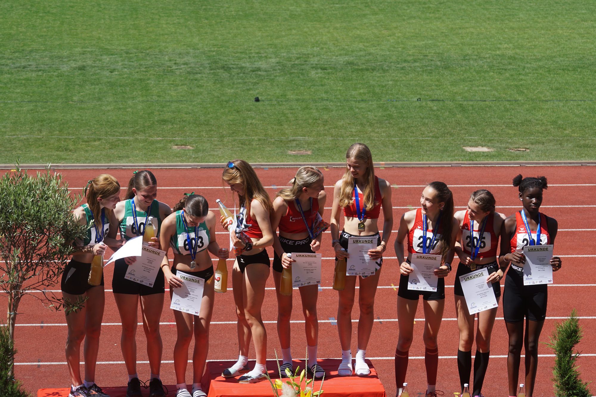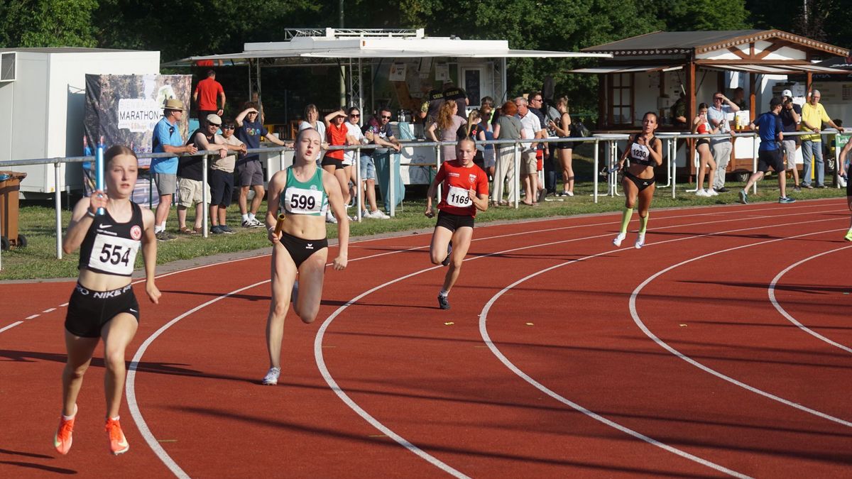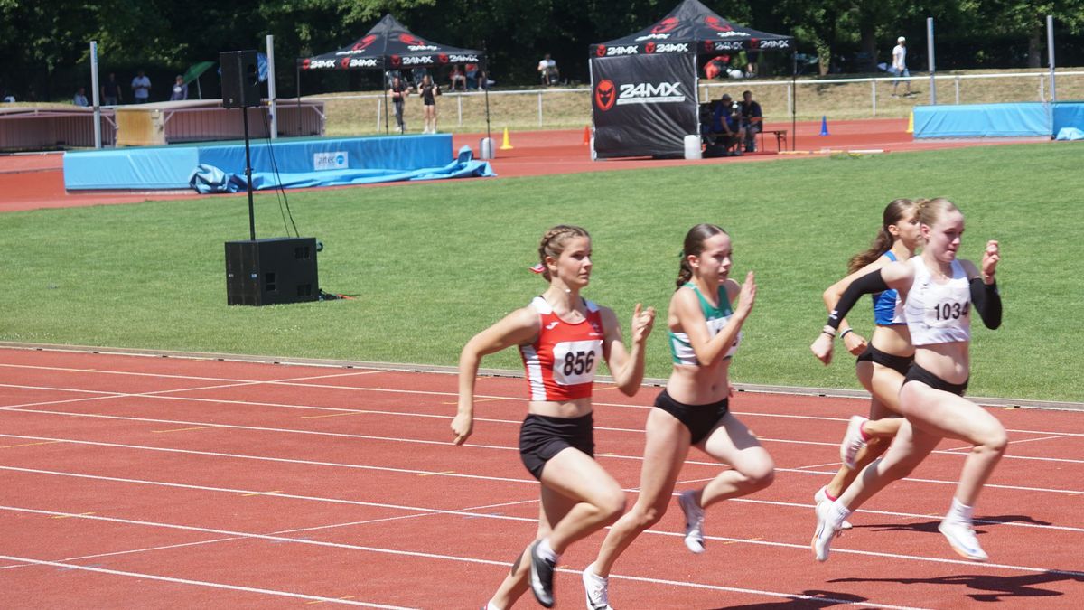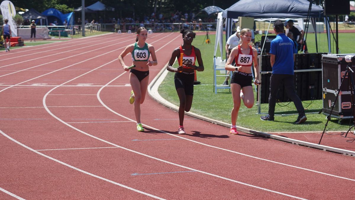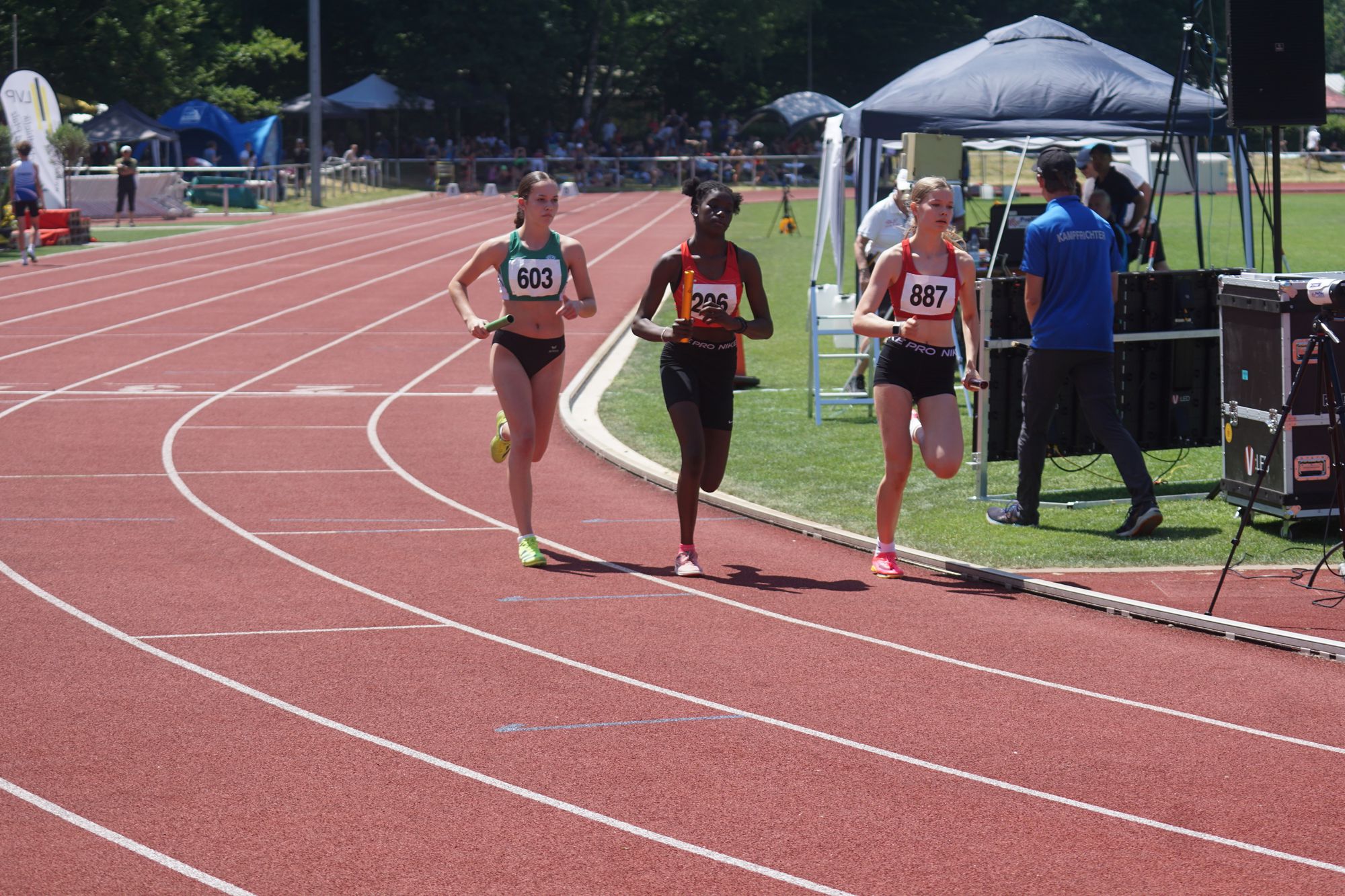 In der Reihenfolge Lotte Schwarz, Linda Schmitt und Greta Lucia Ritz - alle Hünfelder SV - laufen die Mädels in der dicksten Mittagshitze die 3x800m-Staffel. Die Staffel der StG USC Mainz/LC Bingen liegt von Anfang an in Führung. Am Ende wird es aber noch mal ganz knapp; aber der Schlusssprint von Greta reicht nicht mehr ganz. 1,01 Sekunden hinter der StG USC Mainz/LC Bingen landen unserer Mädels mit einer Zeit von 7:23,36 Minuten auf dem zweiten Platz. In der aktuellen Deutschen Bestenliste ist das Platz 8.