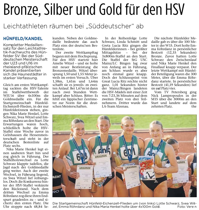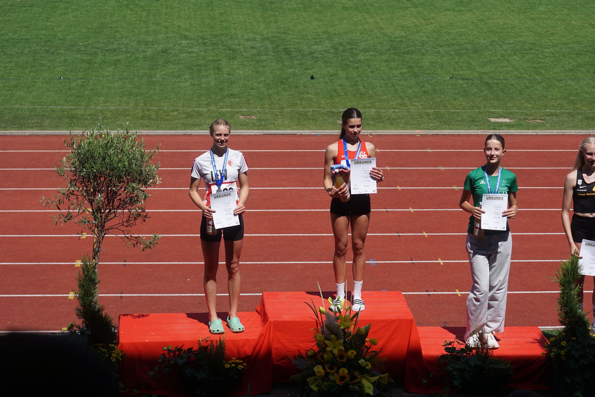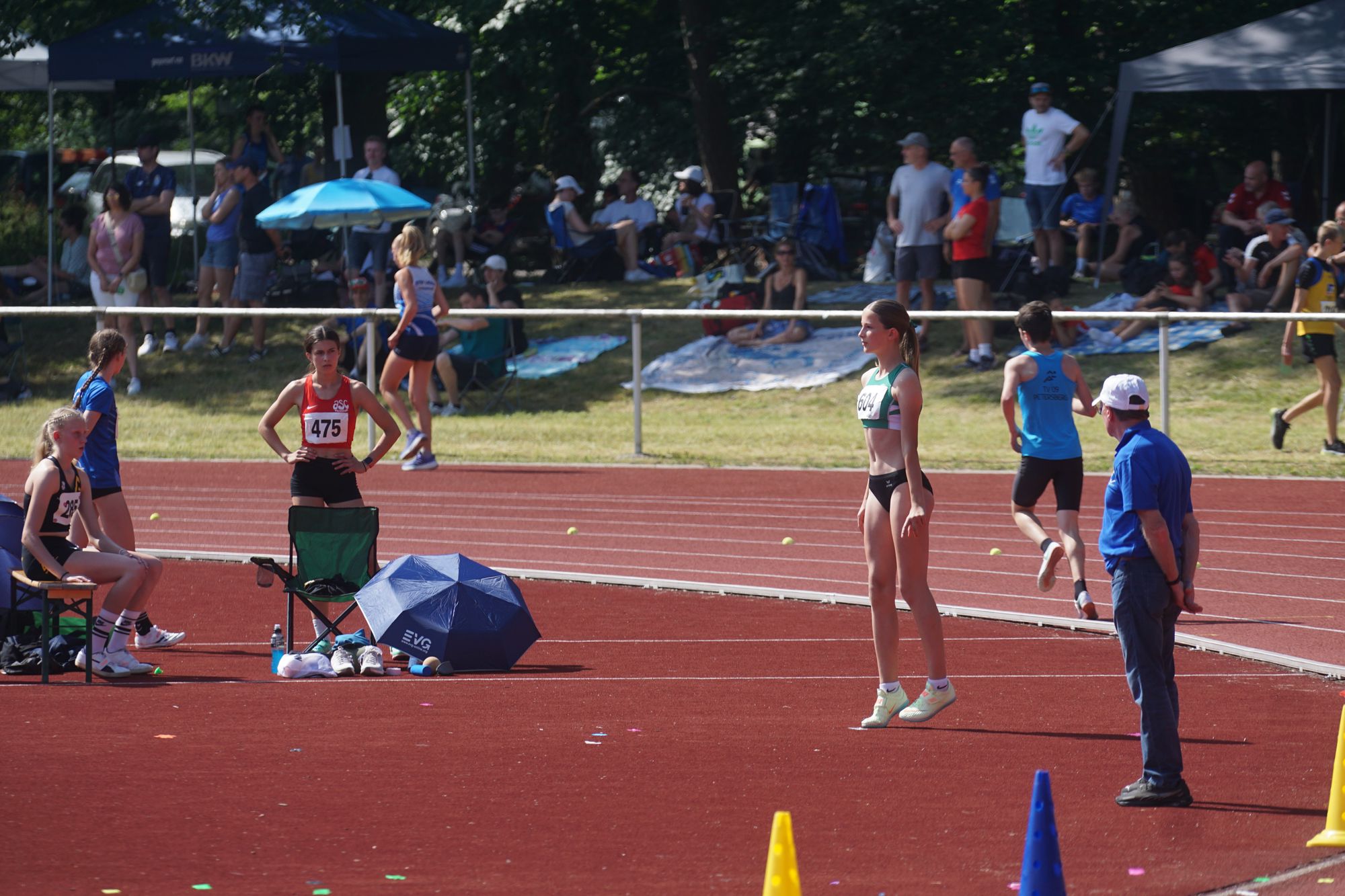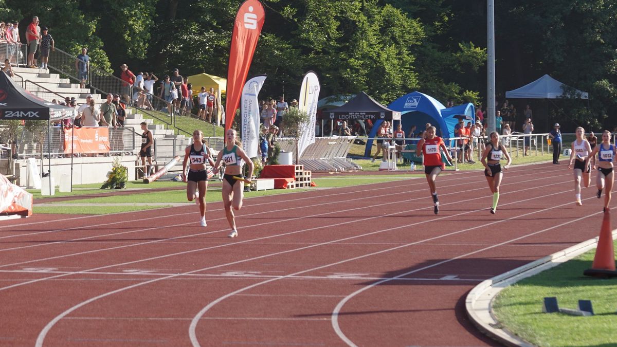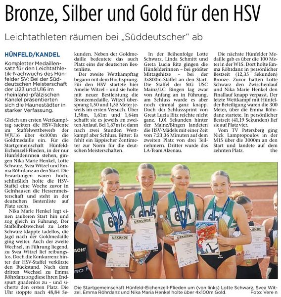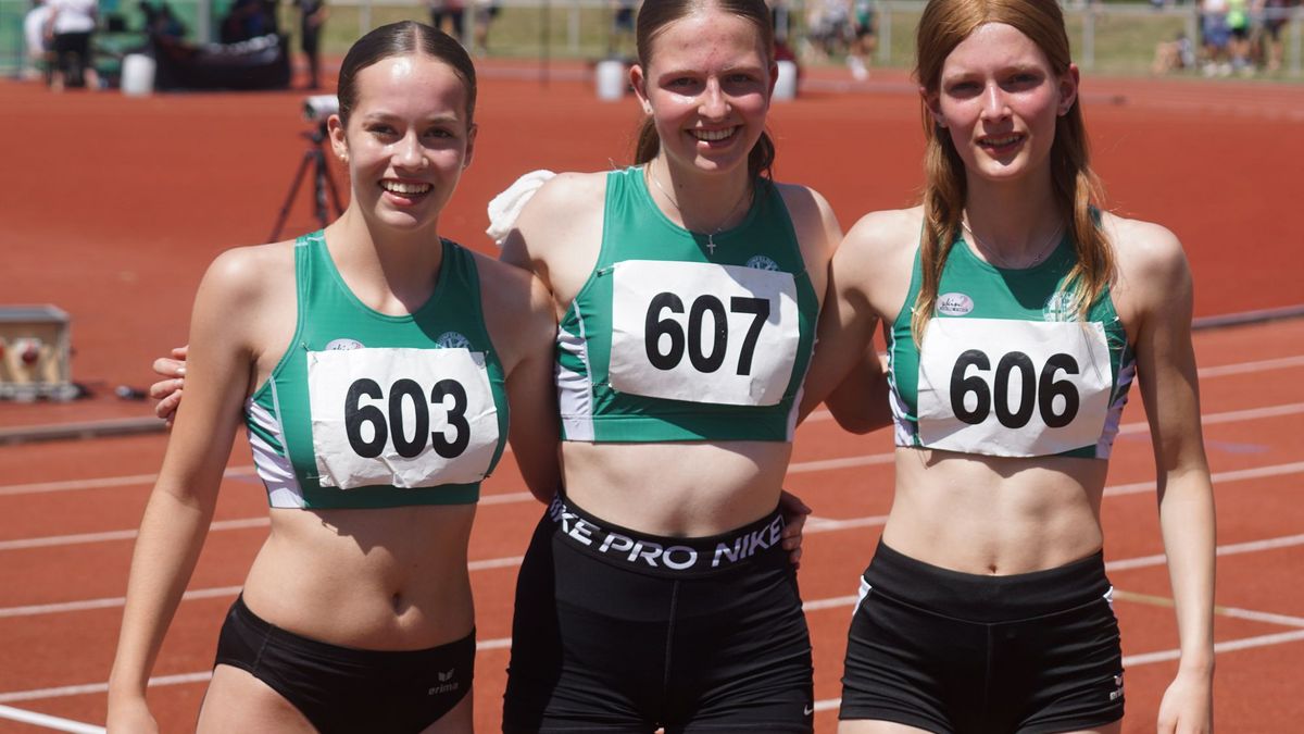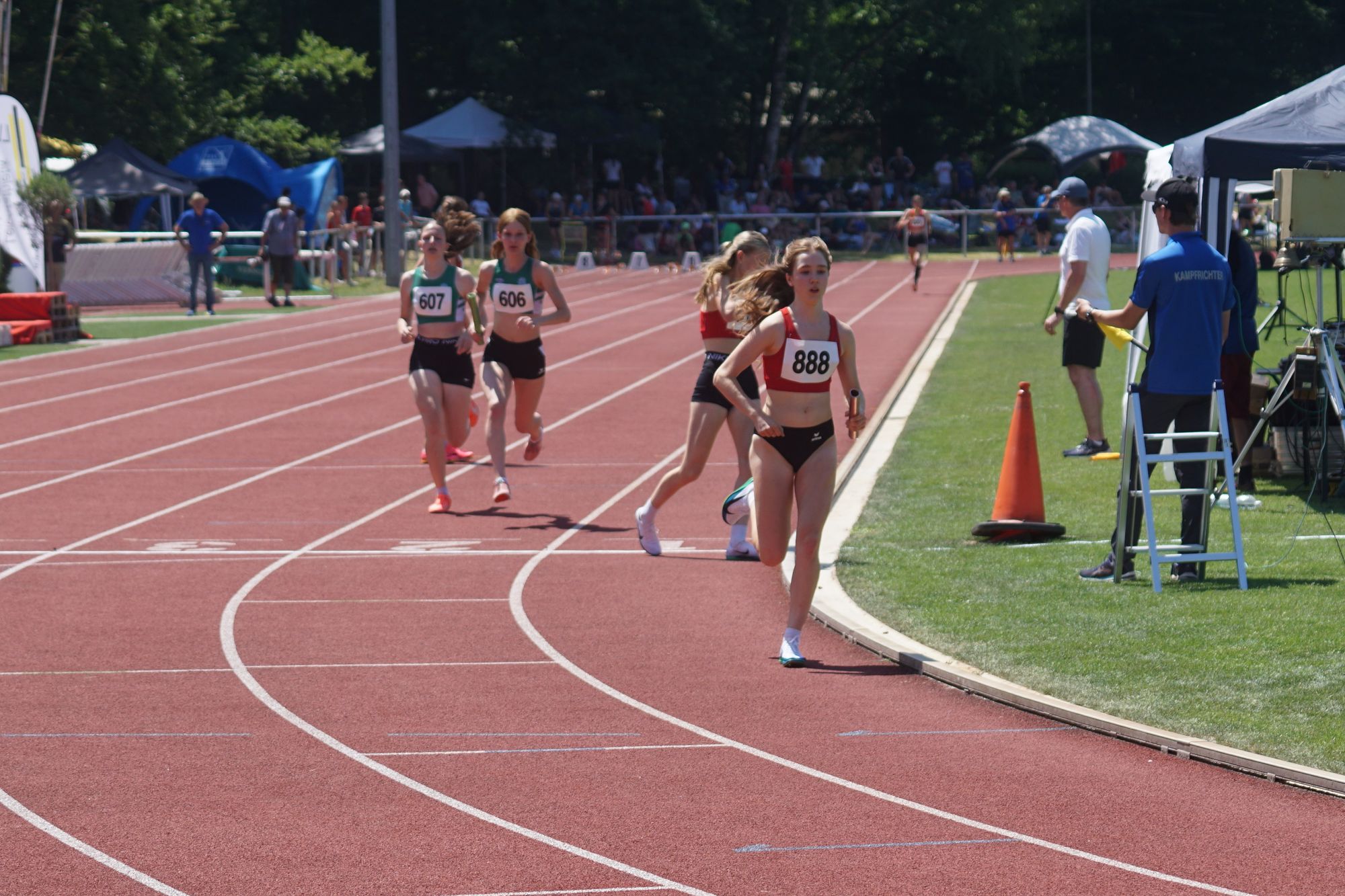 In der Reihenfolge Lotte Schwarz, Linda Schmitt und Greta Lucia Ritz - alle Hünfelder SV - laufen die Mädels in der dicksten Mittagshitze die 3x800m-Staffel. Die Staffel der StG USC Mainz/LC Bingen liegt von Anfang an in Führung. Am Ende wird es aber noch mal ganz knapp; aber der Schlusssprint von Greta reicht nicht mehr ganz. 1,01 Sekunden hinter der StG USC Mainz/LC Bingen landen unserer Mädels mit einer Zeit von 7:23,36 Minuten auf dem zweiten Platz. In der aktuellen Deutschen Bestenliste ist das Platz 8.