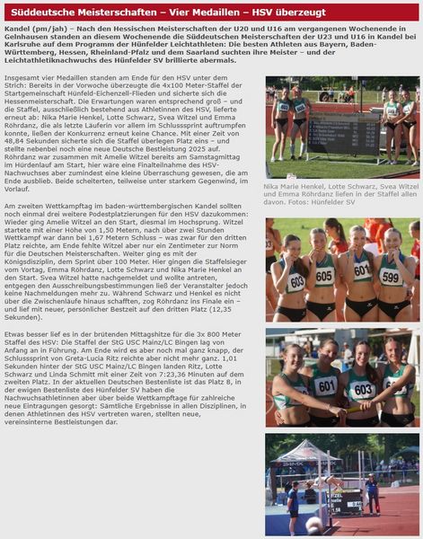 Und die nächste Meisterschaft bei den Leichtathleten. Jetzt höherklassiger! Nach den Hessischen Meisterschaften der U20 und U16 am vergangenem Wochenende in Gelnhausen standen an diesem Wochenende die Süddeutschen Meisterschaften der U23 und U16 in Kandel bei Karlsruhe auf dem Programm. Süddeutsche Meisterschaften bedeutet geografisch gesehen, die besten Athleten aus Bayern, Baden-Württemberg, Hessen, Rheinland-Pfalz und dem Saarland suchen ihre Meister.
