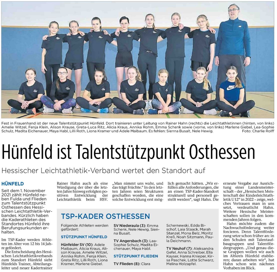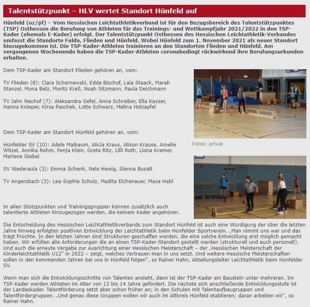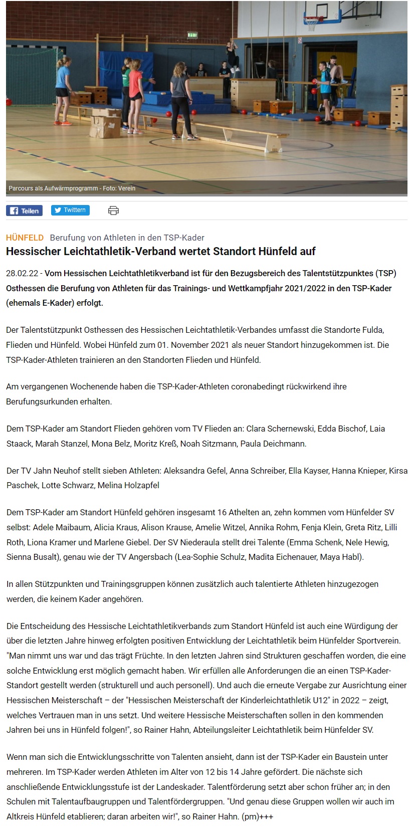 Vom Hessische Leichtathletikverband ist für den Bezugsbereich des Talentstützpunktes (TSP) Osthessen, durch CORONA bedingt etwas verzögert, nun die Berufung von Athleten für das Trainings- und Wettkampfjahr 2021/2022 in den TSP-Kader (ehemals E-Kader) des Hessischen Leichtathletik-Verbandes erfolgt.