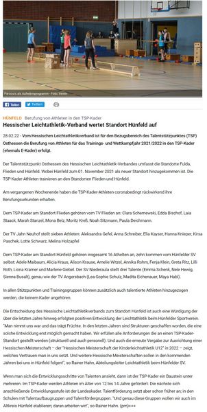 Der Talentstützpunkt Osthessen des Hessischen Leichtathletik-Verbandes umfasst die Standorte Fulda, Flieden und Hünfeld. Wobei Hünfeld zum 01. November 2021 als neuer Standort hinzugekommen ist. Die TSP-Kader-Athleten trainieren an den Standorten Flieden und Hünfeld.