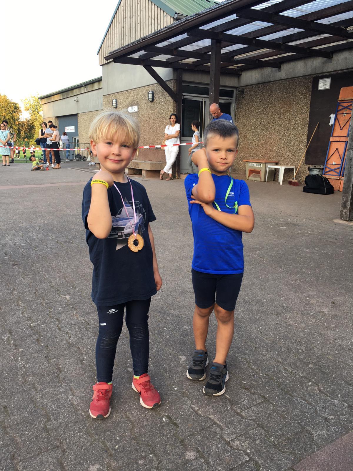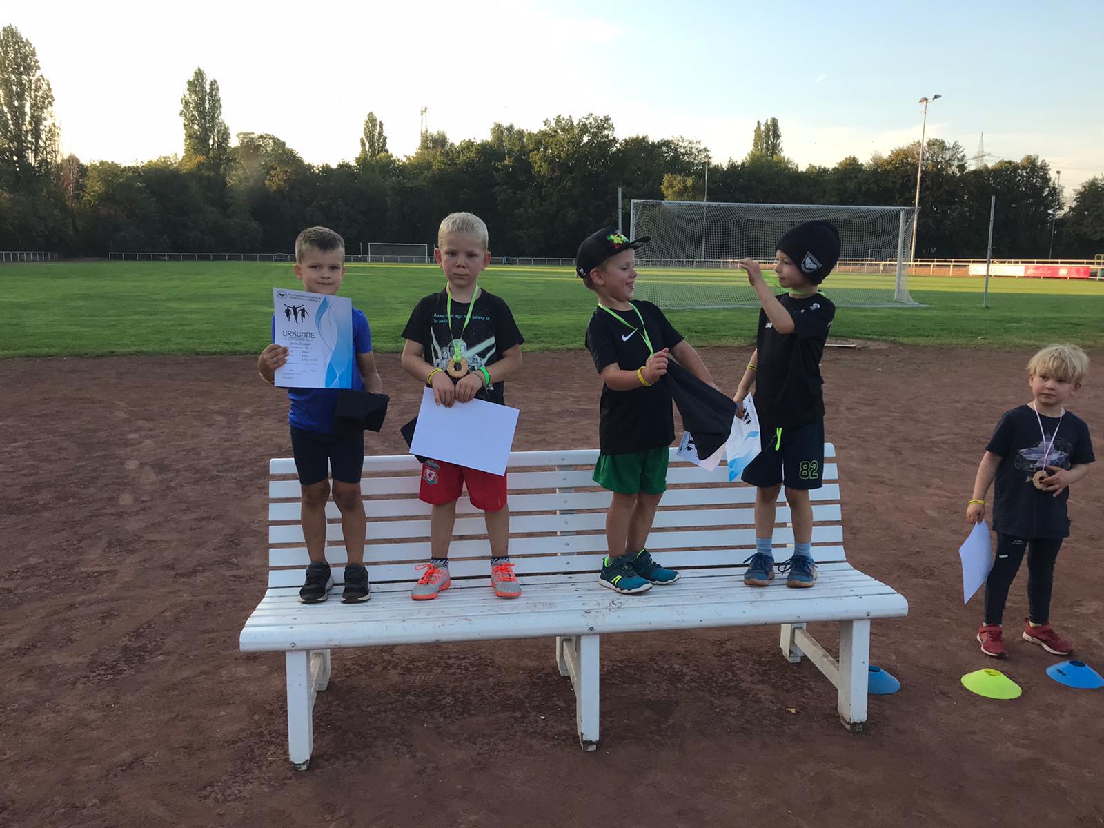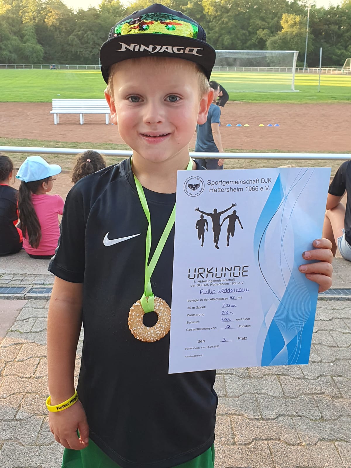 Den letzten Teil der Reihe stellte der Abschlusswettkampf dar. Dieser fand, für diese Zeit ganz klassisch, in der Late Season am 14. September bei strahlendem Sonnenschein auf dem Sportgelände des Vereins statt. Im Vorfeld wurde in vertrauensvoller und konstruktiver Zusammenarbeit mit der Stadt Hattersheim gemeinsam ein Hygienekonzept entwickelt. Die Resonanz auf den geplanten Wettkampf war groß. Im Vorfeld wurden, neben den Kindern, auch Geschwister, Eltern und Großeltern eingeladen. „Aber irgendwann zeigte meine Excelliste mehr als 300 Personen“, erinnert sich Maier. „Und als dann nach der finalen Version des Hygienekonzepts feststand, dass lediglich maximal 150 Personen für die Veranstaltung zugelassen werden, musste ich leider einigen Leuten aus dem Umfeld der Kinder wieder absagen.“ Letztlich gingen insgesamt 82 Kinder an den Start (28 aus der U6, 34 aus der U8 und 20 aus der U10). Alle Absolventen bekamen eine Urkunde und ein fluoreszierendes Armband mit der Aufschrift „Flotter Hüpfe – SG DJK Hattersheim". „Alle Kinder trugen dann ganz stolz ihre Armbänder, erzählten davon zu Hause und im Kindergarten und machten damit richtig Werbung für unseren Verein und die Sportart Leichtathletik“, berichtet Maier.