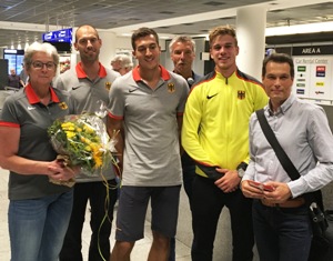 HLV-Vizepräsident Klaus Schuder (rechts) hat am Frankfurter Flughafen die hessischen Nachwuchs-Leichtathleten bei den U23-Europameisterschaften in Bydgoszcz (Polen) sowie DLV-Delegationsleiterin und HLV-Präsidentin Anja Wolf-Blanke (links) empfangen. 800-Meter-Läufer Marc Reuther vom Wiesbadener LV (2. von rechts) gewann bekanntlich die Bronzemedaille, der Darmstädter Zehnkämpfer Dennis Hutterer (Mitte) wurde mit persönlicher Bestleistung Siebter. Wer auf dem Foto fehlt? 400-Meter-Läufer Constantin Schmidt von der TG Obertshausen und Mittelstrecken-Bundestrainer Georg Schmidt. Beide warteten in diesem Moment nämlich am Gepäckband auf ihre Reiseutensilien, letztlich ohne hundertprozentigen Erfolg - ein Teil des Gepäcks soll auf der Strecke geblieben sein. Was übrigens nicht der einzige Fauxpas gewesen ist, denn das Flugzeug war schon mit zwei Stunden Verspätung in die Luft gestiegen. Auf dem Bild weiterhin zu sehen sind Physiotherapeut Rainer Schubert (2. von links) und der Leitende Bundestrainer Sprint/Langsprint Volker Beck (3. von rechts). tin.