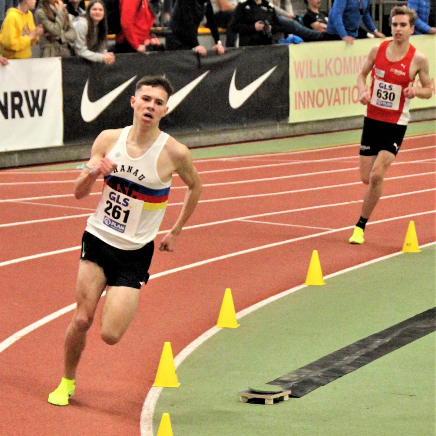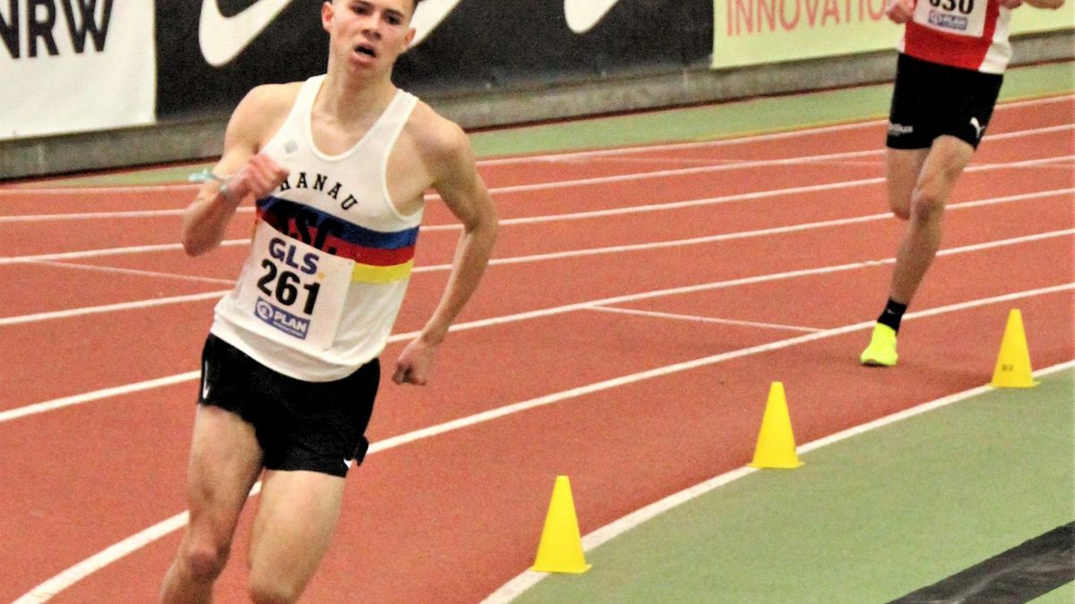 Der mit einer Bestzeit von 8:20,97 Minuten gemeldete Athlet aus Münster übernahm zwar nach Zwischenzeiten von 2:52 Minuten und 5:46 Minuten an den Kilometermarken eins und zwei die Führung, doch während der Großteil der 20 Läufer abfiel, blieb ihm Tristan Kaufhold dicht auf den Fersen. Taktisch während der gesamten 15 Hallenrunden stets auf der Höhe und konsequent die Innenbahn nutzend, wählte der Youngster den perfekten Zeitpunkt, um seinerseits den entscheidenden Angriff zu starten. Als er auf der vorletzten Zielgeraden mit einem Frequenzwechsel spielerisch an Silas Zahlten vorbeizog und eine 27-Sekunden-Schlussrunde auf den Tartan trommelte, war der Favorit läuferisch und mental geschlagen. In 8:29,33 Minuten holte Tristan Kaufhold seinen ersten U20-Titel vor Zahlten (8:30,57 Minuten) und Jonas Kulgemeyer (OTB Osnabrück/8:31,31 Minuten), hatte dabei sogar noch Reserven. “Ich war überrascht, dass niemand mitgegangen ist und hätte auf der Zielgeraden noch weiter beschleunigen können”, erklärte der SSC-Athlet nach seinem Triumph. Der soll der Auftakt zu einer Erfolgsserie in 2023 sein, denn Anfang Mai startet Tristan Kaufhold bei der 5000-Meter-Meisterschaft und hat für den Sommer Ambitionen auf weitere U18 und U20-Titel sowie die Qualifikation zur Jugend-Europameisterschaft in Israel angemeldet.