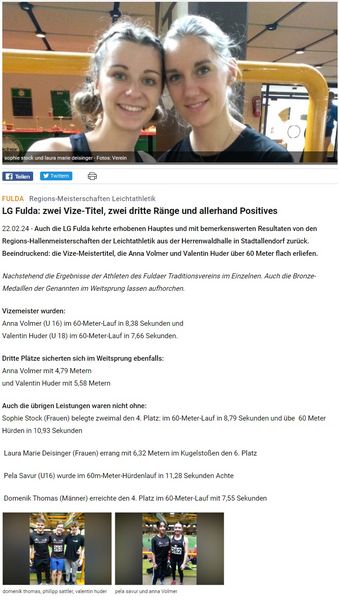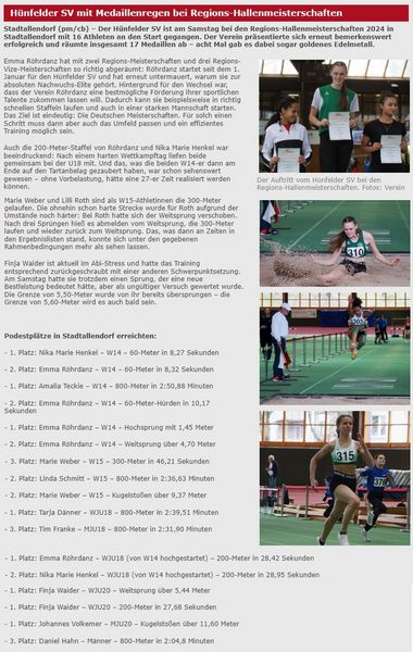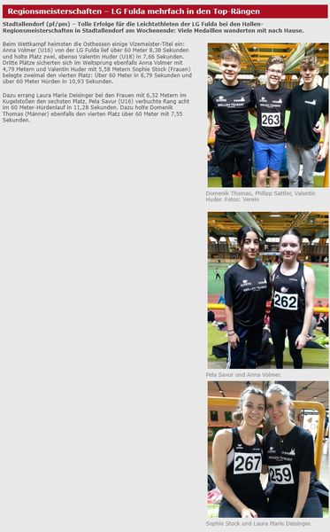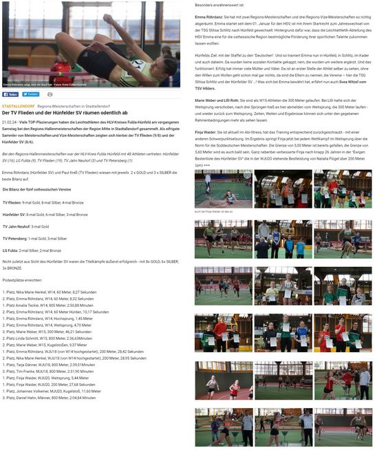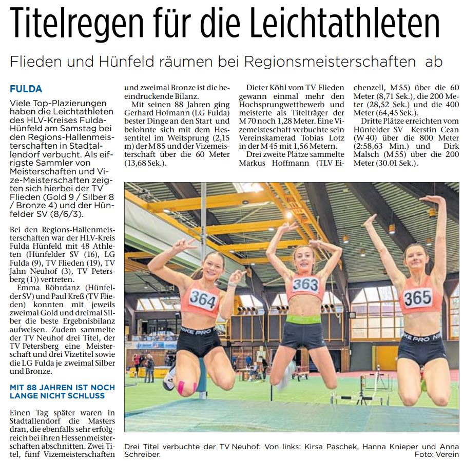 Bei den Regions-Hallenmeisterschaften war der HLV-Kreis Fulda Hünfeld mit 48 Athleten (Hünfelder SV (16), LG Fulda (9), TV Flieden (19), TV Jahn Neuhof (3), TV Petersberg (1)) vertreten.