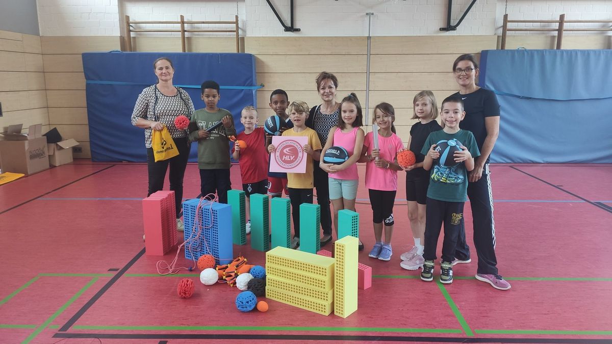 Am zweiten Trainingstag, am 17.09.2024, konnten die Vertreter des TV Friedrichstein, Jutta Mogk (Abteilungsleiterin Leichtathletik) und Hans-Jürgen Kramer (Geschäftsführer) den ansprechenden Gewinn im Beisein der Schulleitung, Frau Ines Franke, an die Kinderleichtathletik-AG übergeben. Mit Begeisterung brachten die Kinder sofort gemeinsam mit ihrer Trainerin Melanie Kellner die neuen Sportgeräte für unterschiedliche Bewegungsaufgaben zum Einsatz. Teil des Materialpakets waren auch das Gütesiegel des HLV, das die Grundschule Helenentalschule nun sichtbar als Kooperationsschule kennzeichnet sowie ein vielfältig einsetzbares Übungskartenset für den Bundesjugendspiel-Wettbewerb und methodische Handreichungen für die Leichtathletik in der Schule.