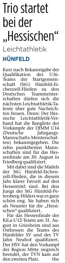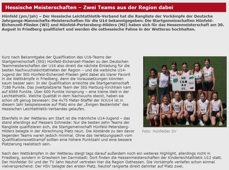 Der Hessische Leichtathletik-Verband hat die Rangliste der Vorkämpfe der DJMM U14 (Deutsche Jahrgangs-Mannschafts-Meisterschaften) bekanntgegeben. Die zehn punktbesten Mannschaften sind für das Hessenfinale am 30. August 2025 in Friedberg qualifiziert.