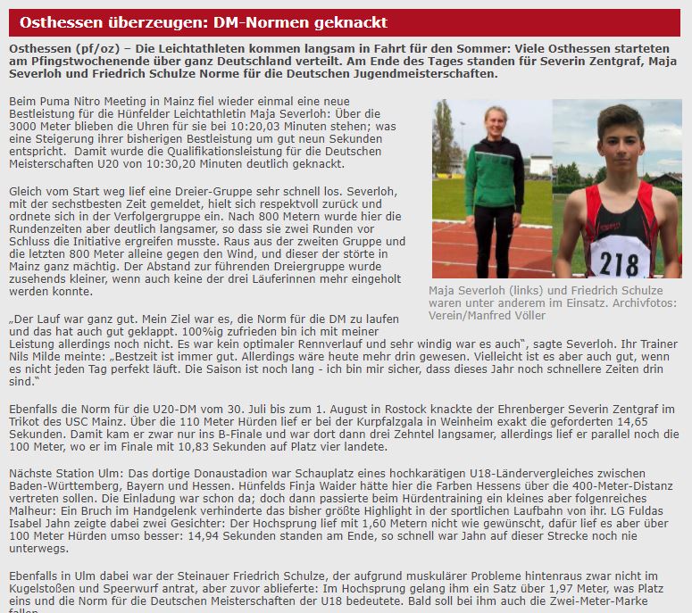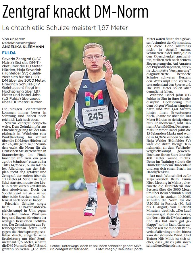 Finja Waider hätte hier die Farben Hessens über die 400-Meter-Distanz vertreten sollen. Die Einladung für die Hünfelderin war schon da; doch dann passierte beim Hürdentraining ein kleines aber folgenreiches Malheur: Ein Bruch im Handgelenk verhinderte das bisher größte Highlight in der sportlichen Laufbahn von ihr.