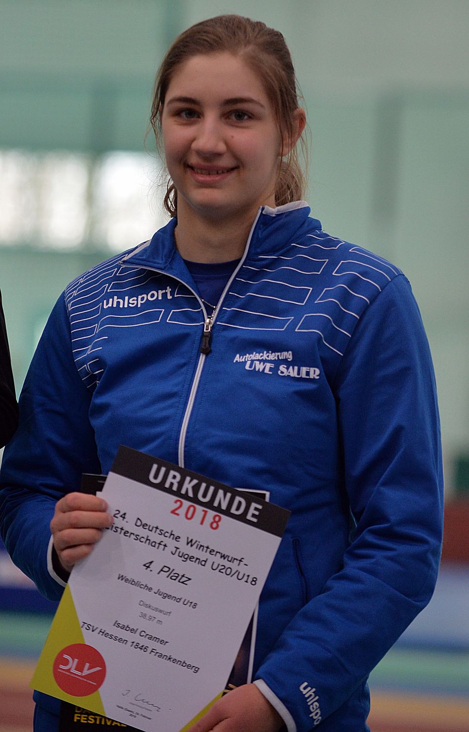 Diesen gab es auch für Isabel Cramer. Doch die U18-Diskuswerferin im Trikot des TSV Hessen Frankenberg sah bei der Siegerehrung alles andere als glücklich aus. Kein Wunder, lag die Nordhessin mit 38,97 Metern doch lange Zeit auf dem Bronzerang. Mit ihrem letzten Wurf, der zwei Zentimeter weiter war, verdrängte Letizia Marscio (ART Düsseldorf) sie dann noch aus den Medaillenrängen.