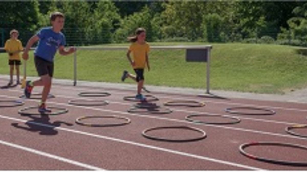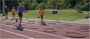 Es werden drei nebeneinanderliegende Reifenbahnen mit jeweils 5 Reifen aufgebaut. Die Kinder sollen anschließend eine vor-gegebene Sprungfolge durch die 3 Bahnen absolvieren. Korrekt sind Sprünge innerhalb der Reifen, auch Reifenberührungen mit den Füßen sind erlaubt. Eine Bodenberührung außerhalb des Reifens gilt als Fehler, ebenso eine falsche Sprungfolge. Die vollständige Trainingskarte und weitere Details zur Übung findet Ihr hier.
