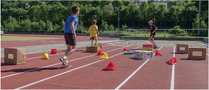 In einem Feld werden mehrere Hindernisse unterschiedlicher Art und unterschiedlicher Höhe wie beispielsweise Bananenkisten, Schaumstoffblöcke, Hütchen, Kinderhürden o.Ä. aufgebaut. Sofern Sicherheits- und Leistungsaspekte beachtet werden, können auch mehrere Geräte zu einem Hindernis „kombiniert“ werden. Die Kinder überspringen die Hindernisse auf vorgegebene Art. Zum Beispiel darf der Absprung stehts nur mit links erfolgen. Aber auch viele weitere Möglichkeiten gibt es hier. Die vollständige Trainingskarte und weitere Details zur Übung findet Ihr hier.