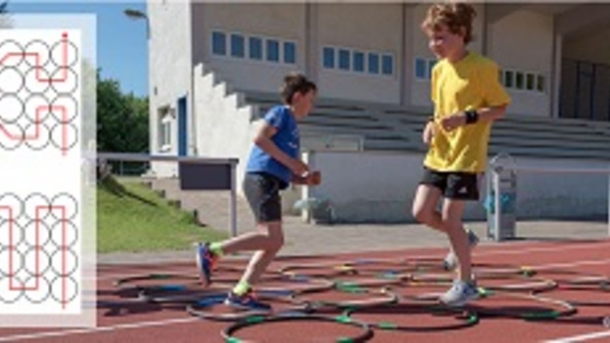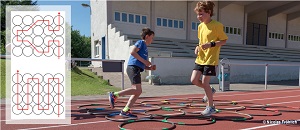 Die Kinder absolvieren hier in einem aus Reifen gelegten Quadrat einen vorgebenen Parcours dreimal. Dabei wechselt in jedem Durchgang die Bewegungsaufgabe. So springt man im ersten Durchgang einbeinig rechts, dann im zweiten Druchgang beidbeinig, sowie abschließend einbeining links den Parcours ab. Das nächste Kind startet wenn das vorherige Kind den vierten Reifen passiert hat. Die vollständige Trainingskarte und weitere Details zur Übung findet Ihr hier.