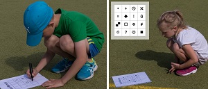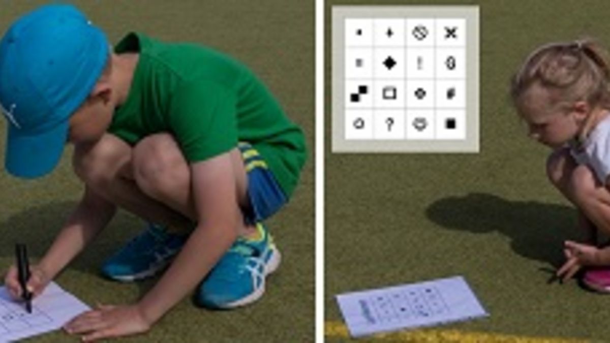 Die Kinder werden in mehreren Teams (etwas 4 Kinder) eingeteilt. Als Zielpunkt wird ein Blatt mit einem Raster ausgelegt. Desweiteren erhalten alle Teams an ihrem Startpunkt einen Zettel mit leerem Raster. Ziel ist es das eigene Raster so schnell wie möglich korrekt auszumalen. Dazu läuft jeweils ein Kind zum Zielpunkt, merkt sich eins der Symbole des dort liegenden ausgefüllten Rasterzettels und trägt es dort in das eigene Raster ein. Sobald das Kind beim Team angekommen ist, darf das nächste Kind schon starten. <ENDE/> Es darf immer nur ein neues Symbol pro Kind ergänzt werden. Welchen Team gelingt es als erstes korrekt das eigene Raster auszufüllen? Die vollständige Trainingskarte und weitere Details zur Übung findet Ihr hier.