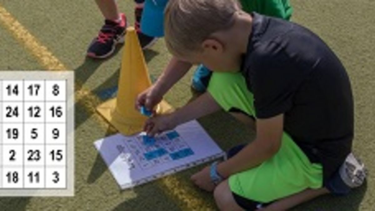 Die Kinder werden in mehrere Mannschaften mit je 4-6 Kindern aufgeteilt. Jedes Team erhält eine Bingo Karte und 25 Zahlenkärtchen. Von der Teambasis läuft das erste Kind eine vorgegene Laufstrecke und darf ein verdecktes Zahlenkärtchen aufnehmen. Zurück beim eigenen Team werd per Handschlag das nächste Kind losgeschickt. Das Kärtchen wird in der Zwischenzeit auf die richtige Position auf der Bingo-Karte gelegt. Das Team was als erstes eine vollständige Reihe, Spalte oder Diagonale gelegt hat gewinnt. Die vollständige Trainingskarte und weitere Details zur Übung findet Ihr hier.