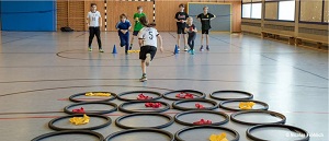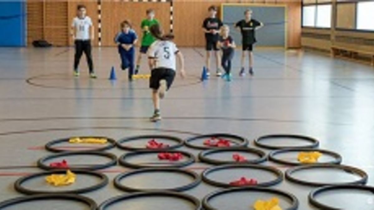 Die Kinder werden in zwei Teams aufgeteilt und positionieren sich hinter einer Startlinie. Auf Kommando starten die Startläufer und legen eine Markierung ihrer Teamfarbe in ein Reifenrechteck. Die nachfolgenden Läufer dürfen die Markierungsgegenstände nur noch in die freien Felder legen. Wer 4 nebeneinander liegen hat gewinnt. Die vollständige Trainingskarte und weitere Details zur Übung findet Ihr hier.