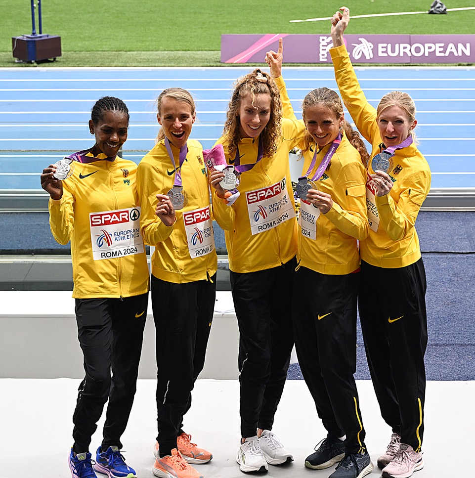 An Tag drei sind insgesamt neun hessische Athletinnen und Athleten in Rom am Start. Den Anfang machten die Langstrecklerinnen Melat Kejeta und Katharina Steinruck. Pünktlich um 9:30 Uhr gab es für die zwei und ihre drei Nationalmannschaftskolleginnen den Startschuss zum Halbmarathon. Trotz schwüler und warmer Temperaturen war es vor allem Kejeta, die lange in der Führungsgruppe mitlaufen konnte. Am Ende stand ein grandioser Platz fünf für sie zu Buche. Steinruck hatte mit den Temperaturen zu kämpfen und erreichte in der Endabrechnung Platz 37. Durch eine starke Teamleistung haben aber beide Grund zum Jubeln: Silber in der Mannschaftswertung und die erste Medaille für Team Hessen!