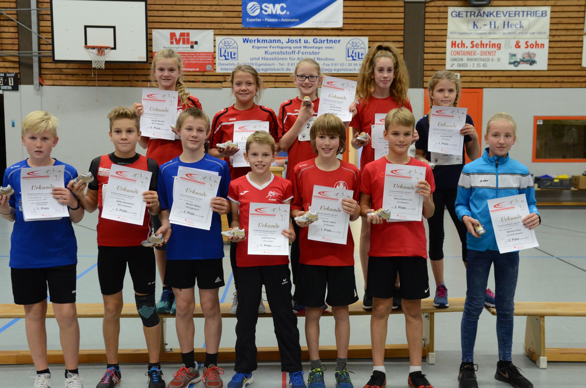 Bei den W10-Mädchen hatte Johanna Hill (TG Traisa) mit 5 Punkten und 3 Tagessiegen einen ebenfalls klaren Vorsprung und konnte den Siegerpokal in Empfang nehmen. Sarah Richter (MTV Urberach, 10 Punkte) und Paula Göller (asc Darmstadt, 15 Punkte) sicherten sich die Liga-Plätze zwei und drei. Bei den M10-Jungen gab es einen Doppelsieg für den TV Seeheim – Jakob Hauer lag in der Schlussrechnung mit 6 Punkten und 2 Tagessiegen um zwei Punkte vor seinem Trainingspartner Lars Wiechmann. Timon Stadie von der SG Egelsbach freute sich mit 11 Punkte über den bronzenen KiLa-Schuh.