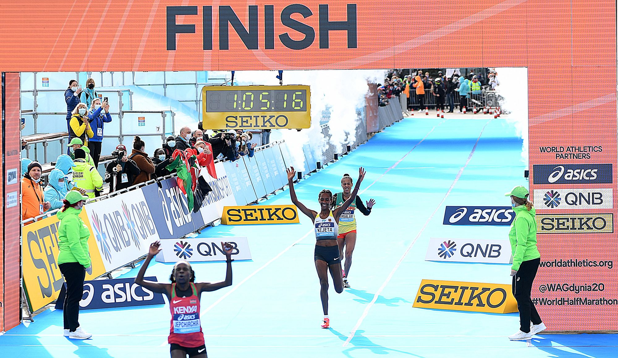 Was für ein Rennen. Die Halbmarathon-Weltmeisterschaft im polnischen Gdynia endete mit zwei echten Knallern. Da wäre natürlich der neue Weltrekord (in einem reinen Frauenlauf) von Peres Jepchirchir (KEN), die sich mit 1:05:16 Stunden den Sieg und die WR-Prämie in Höhe von 55.000 US-Dollar sicherte.